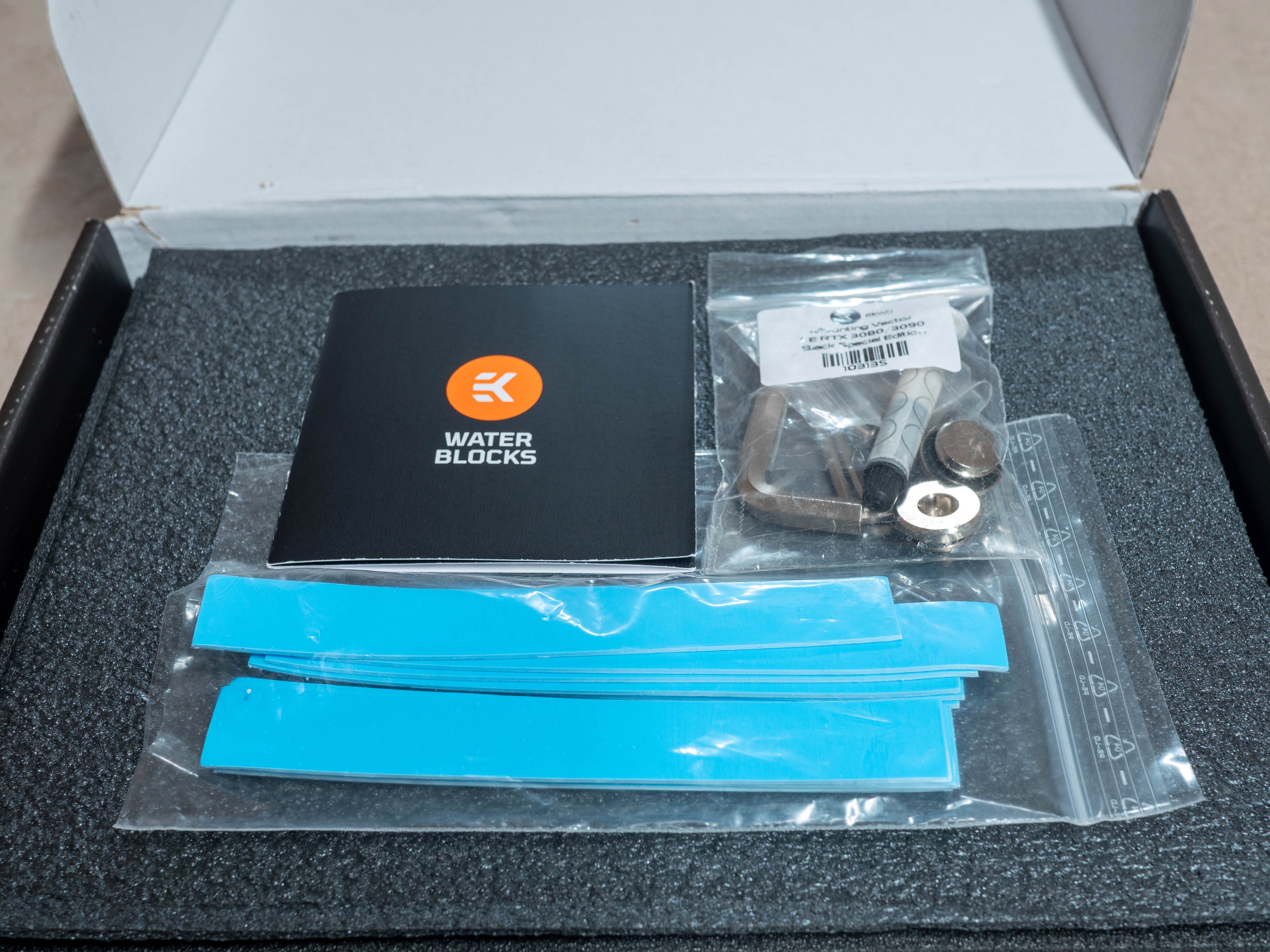 La boîte est en très bon état et le bundle est complet : tout est là (tube de pâte thermique et pads thermiques intacts car j'ai utilisé du Thermal Grizzly). La notice est à télécharger avec un qrcode. Les vis restantes sont inutiles pour une 3080 et sont destinées au montage de la version 3090, elles partagent la même visserie.