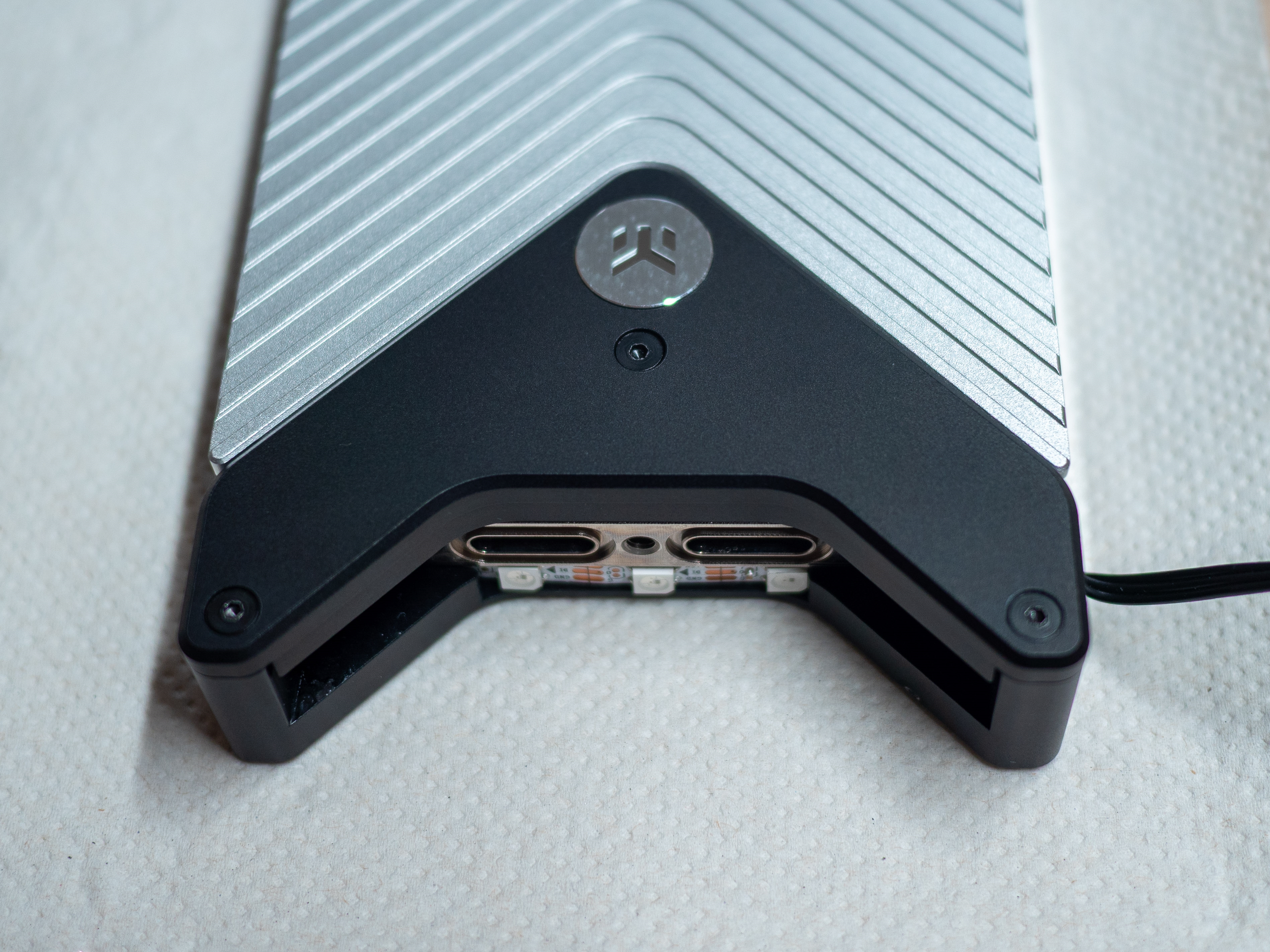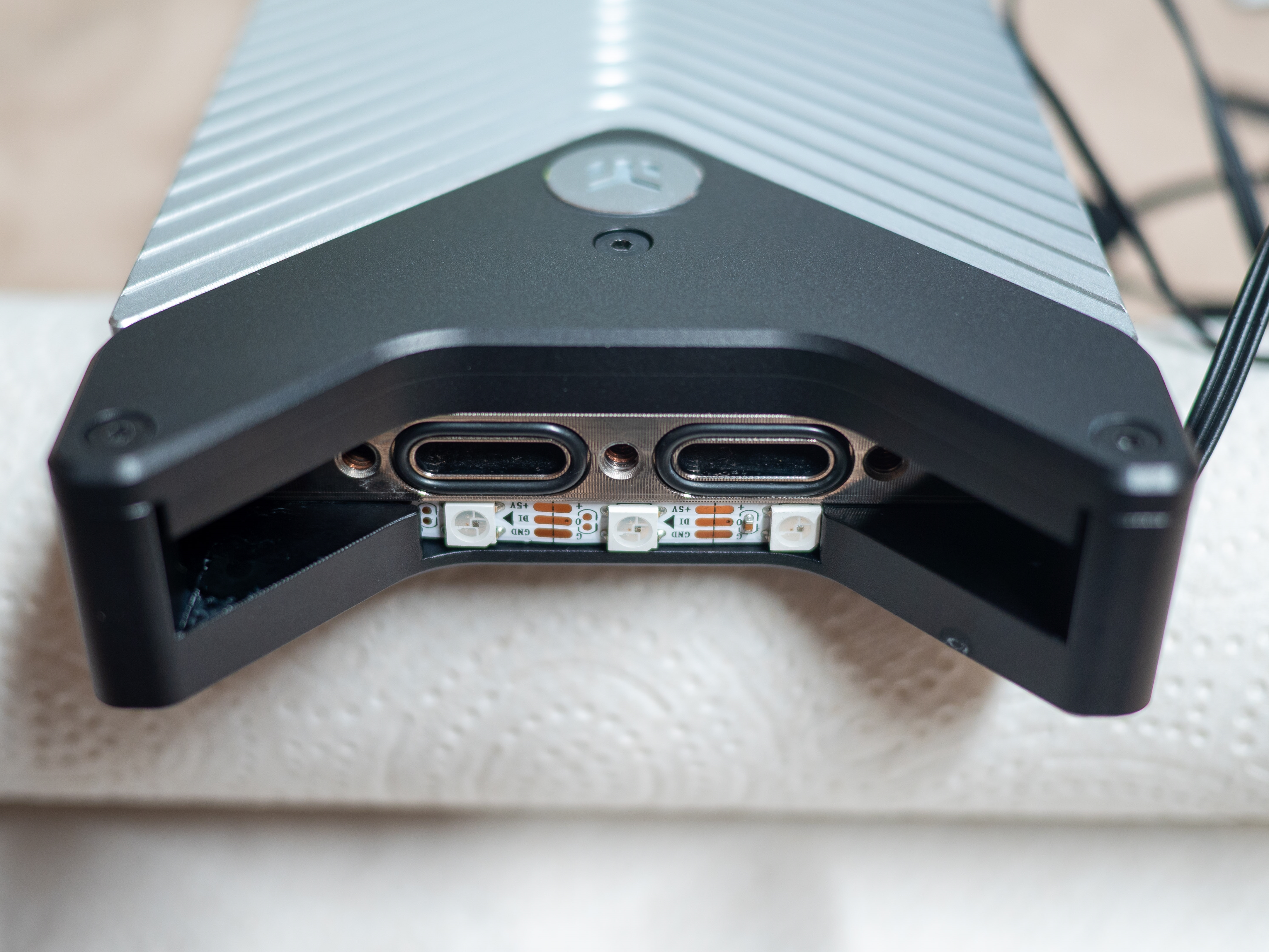 Ensuite, on replace la façade en plexi (nettoyée de la même façon) sur le cadre noir qui supporte aussi la bande de LED D-RGB :