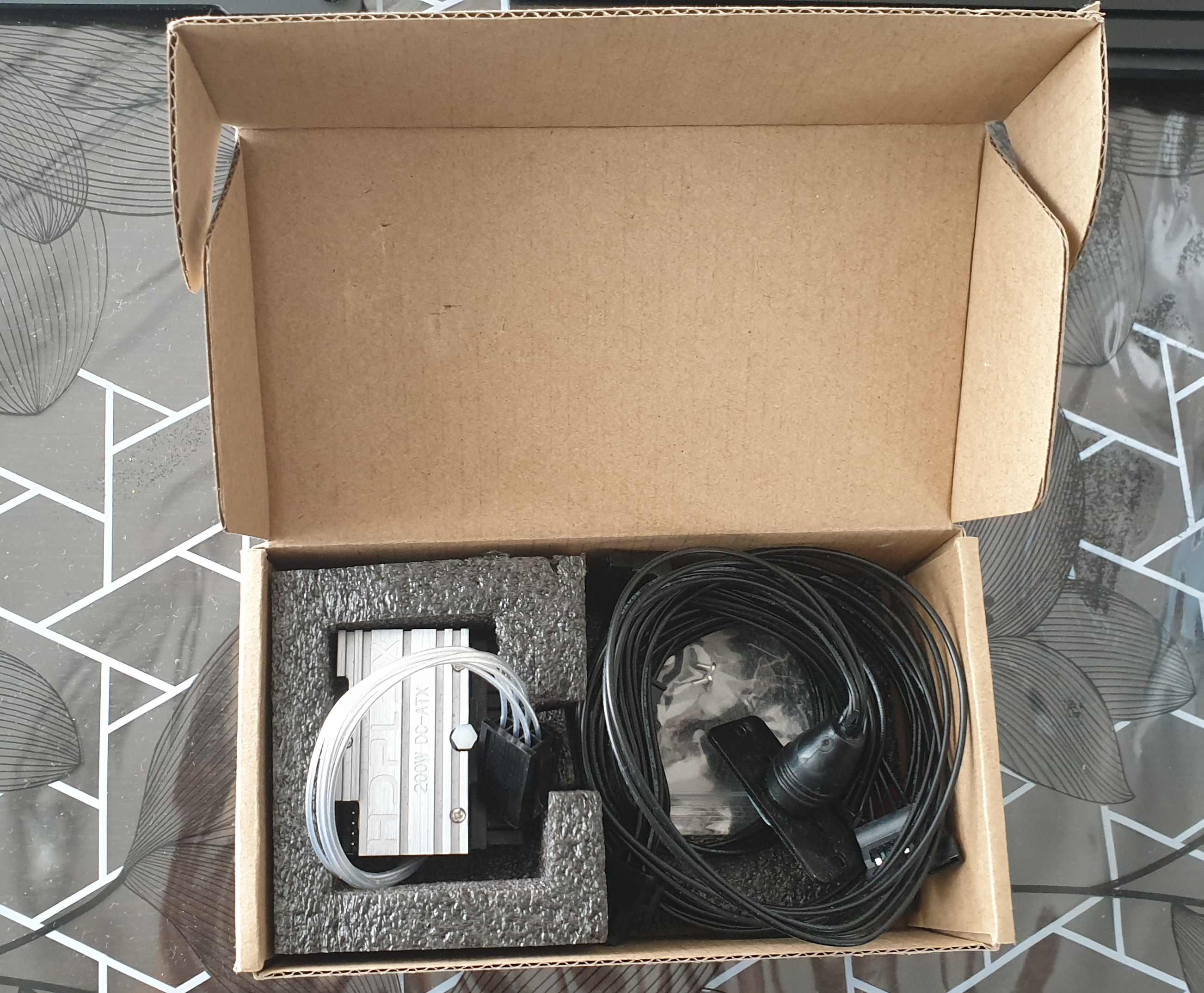 Fonctionne avec un bloc d'alimentation type chargeur de PC portable (non fourni). Bundle complet et emballage d'origine impeccable. Pas de facture mais référence d'achat sur le site HDplex fournie.