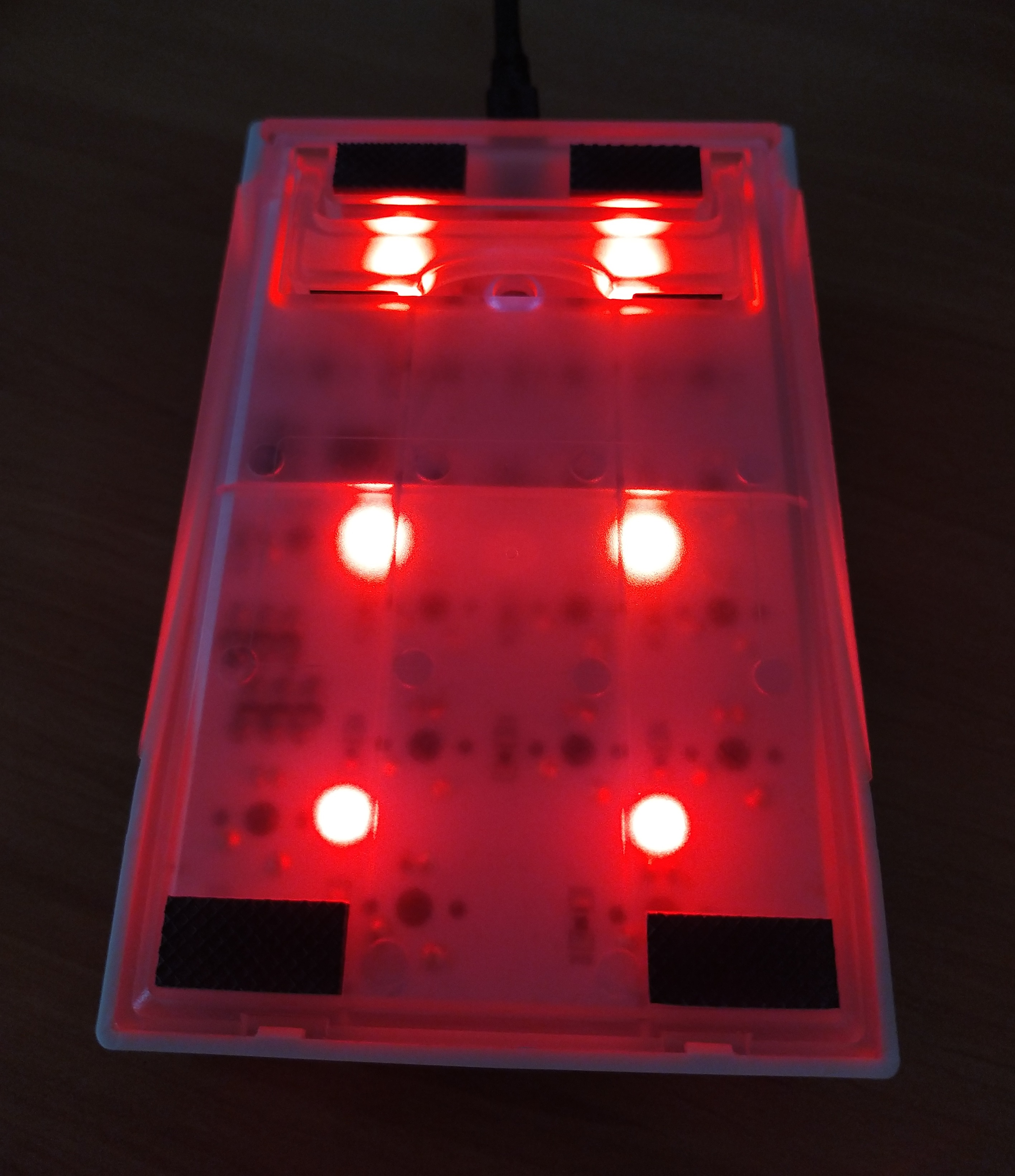 Le châssis est en plastique blanc. Les leds du dessous permettent d'afficher 7 couleurs (fixes ou cycliques) ou éteindre. Les leds du dessus (rétro éclairage clavier) sont blanches et il y a plusieurs modes, on peut régler intensité et vitesse des animations ou éteindre. Les switchs sont des Gateron Blue (ça clique ) La connexion se fait avec un cable usb - usb mini, non fourni.