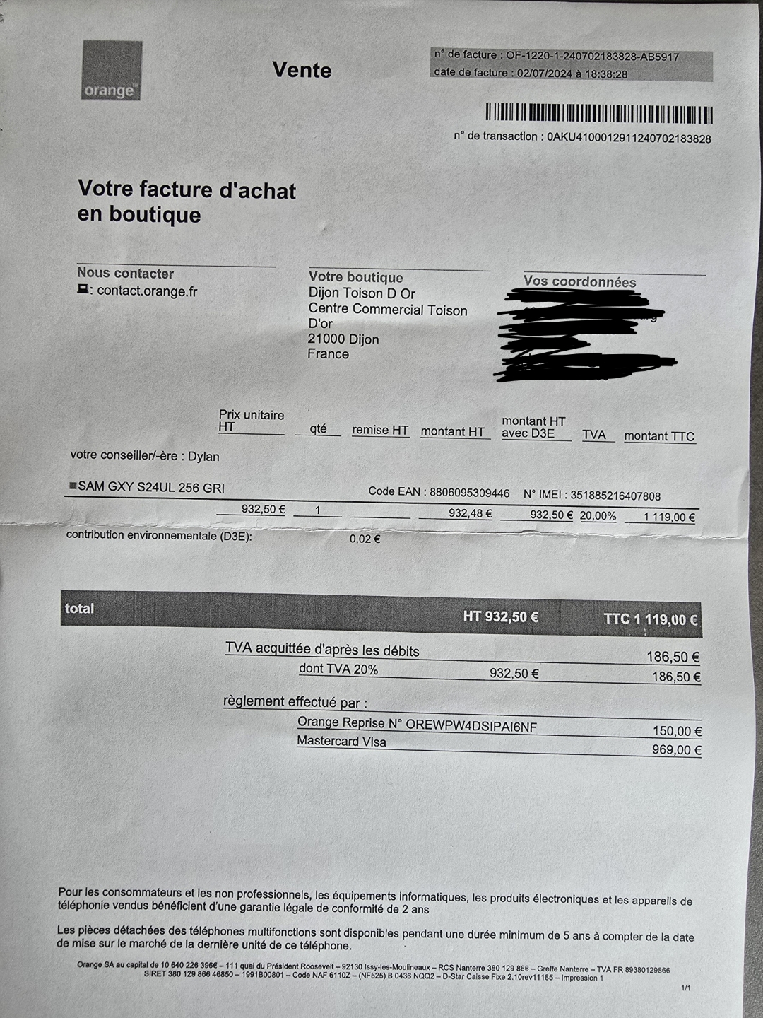 Facture Orange de 07/2024 fourni, encore garantie.