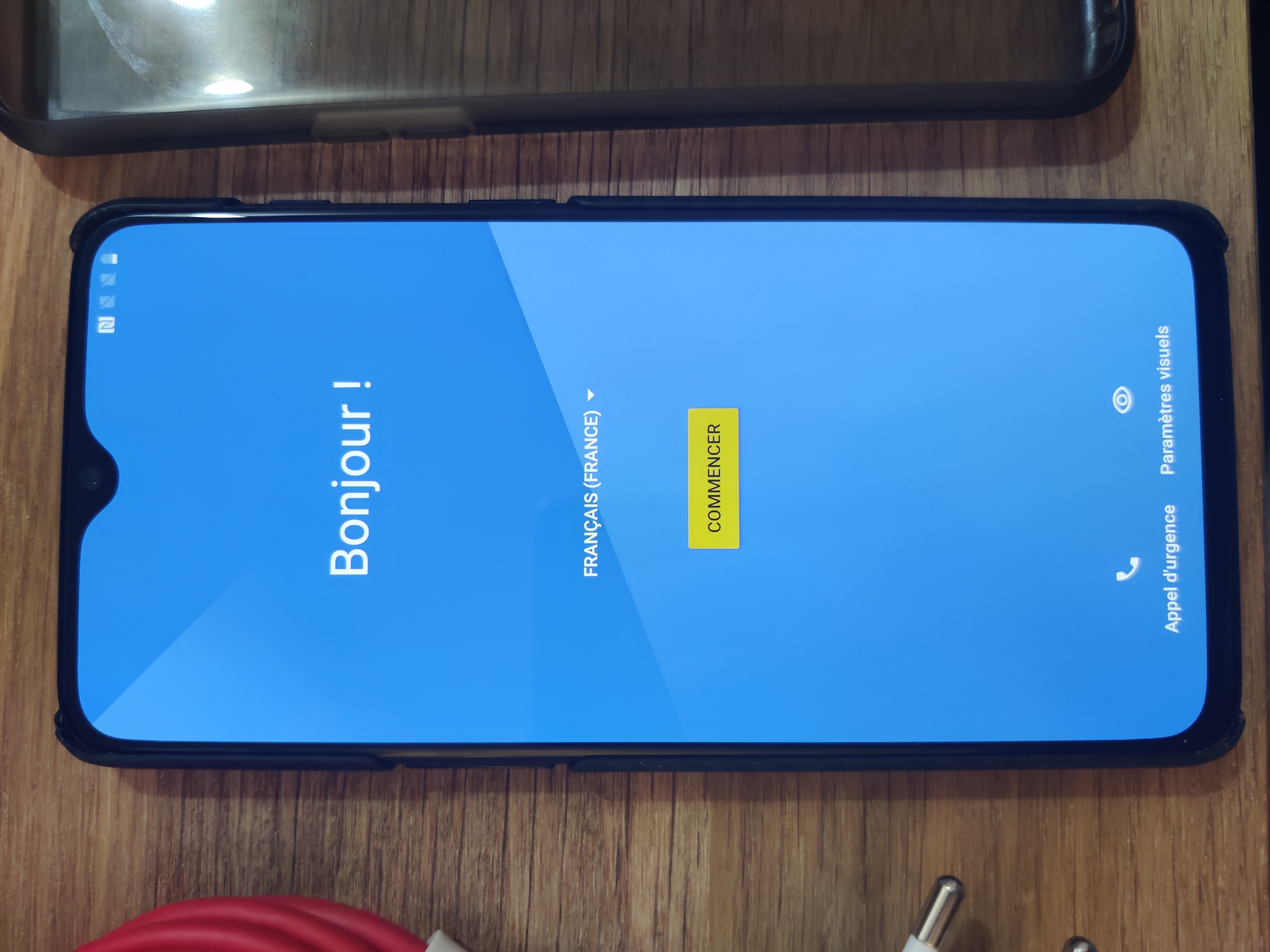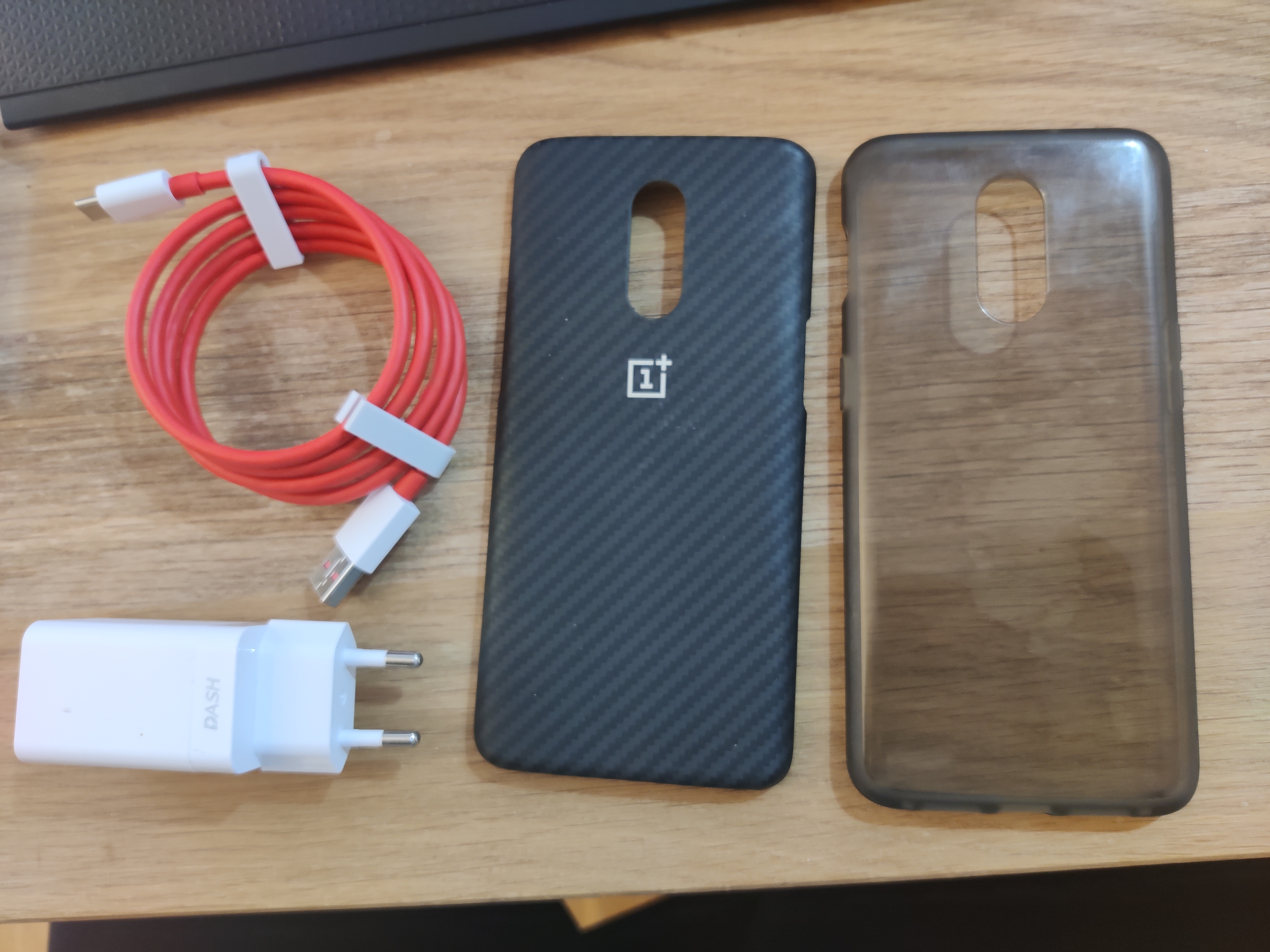 Il est livré avec la coque d'origine et une coque carbone, qui a deux petits coups à gauche et en haut à droite, mais rien de gênant. Egalement le chargeur Warp charge et le câble USB qui va avec, permettant une recharge rapide, et l'adaptateur USB-C vers Jack. Je n'ai plus la boite par contre.