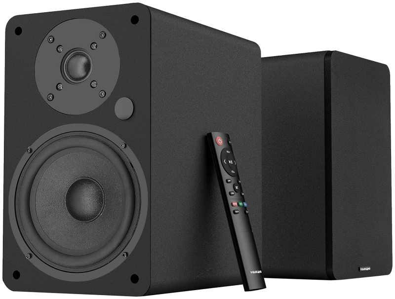 Vulkkano A5, enceintes 2 voies équipées d'un haut-parleur principal de 13 cm de diamètre pour assurer le grave-médium et d'un tweeter pour assurer l'aigu. Il y a tout ce dont tu as besoin, toutes les entrées qu'il faut, le bluetooth, une télécommande, réglages BASS et TREBLE. Il y a une sortie subwoofer pour upgrader le matos en 2.1, la même marque possède notamment un caisson dans la même lignée, avec ce design arrondi sympa. Le caisson Vulkkano SUB8. Comme son nom l'indique c'est un caisson de 8 pouces (20 cm), ce n'est pas la plus grande taille de caisson qui existe loin de là mais ça apportera un surplus de graves vraiment très appréciable pour aider ces petites enceintes format bibliothèques dont la principale lacune sera justement le manque de graves. Et c'est normal car le rendu du grave est principalement lié aux caractéristiques physiques des enceintes, petit diamètre de haut-parleur et petit volume d'enceinte ça se traduit par une faiblesse dans le rendu du grave. Il est important aussi de noter que l'event bass reflex (le trou) qui sert à générer un surplus de basses à l'aide du volume d'air dans l'enceinte, se trouve à l'arrière. Concrètement la position de ces évents à l'arrière implique de ne pas plaquer ces enceintes directement contre le mur, car si l’évent bass reflex est bouché le rendu du grave sera altérer, c'est une contrainte de placement à prendre en considération, il faudra laisser sur ce modèle au moins 15 cm d'espace pour laisser de l'air aux évents arrières.